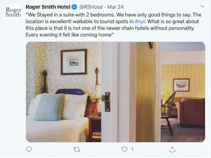 Deo strategije Roger Smith hotela na Twitter-u je uzimanje citata iz pozitivnih pregleda kupaca i stvaranje tweet-ova od njih. Oni su takvu taktiku nastavili tokom čitavog COVID-19 i moramo da kažemo da deluje. Tweet-ovi ne traže da ostavite recenziju ili rezervišete boravak, ali pozitivne reči i atraktivne slike ostavlјaju dobar osećaj.