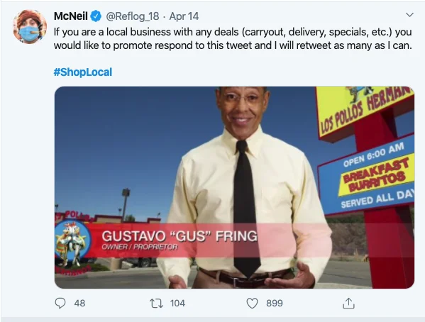 U primeru u nastavku, Connected Kent nudi za podelu pet različitih lokalnih preduzeća za svaki tweet o njihovim uslugama. Zašto ne isprobati ovu strategiju za vaš posao? Odličan je način za privlačenje nove publike na Twitter-u, a istovremeno pomaže i drugim lokalnim preduzećima koja se bore tokom COVID-19 – i to sve besplatno.