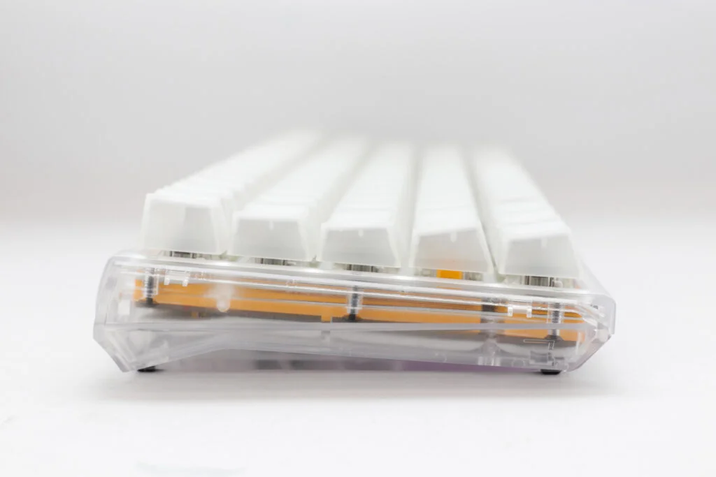 Prozirno kućište takođe vam daje uvid u unutrašnji dizajn tastature. Između ploče i PCB-a nalazi se jarko žuti sloj silikona za ublažavanje pritiska na tastere i još jedan sloj bele pene na dnu kućišta. Takođe potvrđuje da na dnu PCB-a nema LED dioda koje pali naniže; propuštena prilika da se ujednači osvetljenje u celom kućištu i ide all-in na RGB.