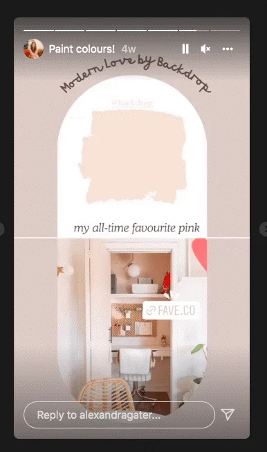 Na primer, pogledajte YouTube-ra za dekoraciju doma Alexandra Gater. Ona koristi Instagram Stories da istakne proizvode iz njenih najnovijih video snimaka o preuređenju doma, kao i njene omilјene dekorativne proizvode. U njenoj “Paint colours!” istaknutoj priči, ona uklјučuje partnerske veze za kupovinu boja koje ona preporučuje.
