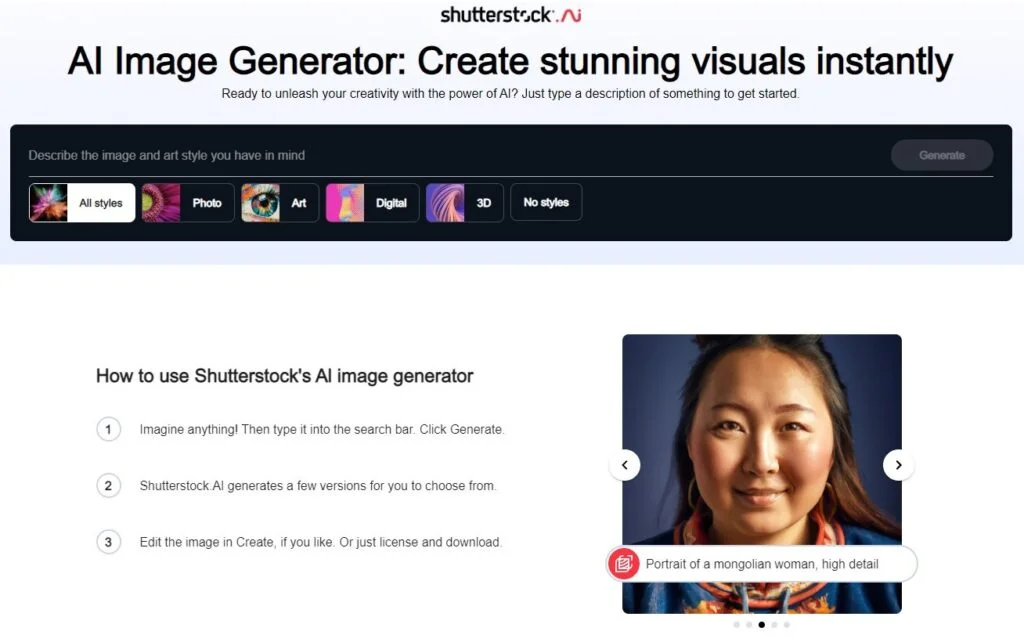 Štaviše, ono što izdvaja Shutterstock rešenje je kombinovanje ovog najsavremenijeg sistema generisanja veštačke inteligencije sa lakoćom korišćenja Shutterstock platforme. Savladali su UX (korisnički interfejs) i čine ga brzim i jednostavnim za početak.