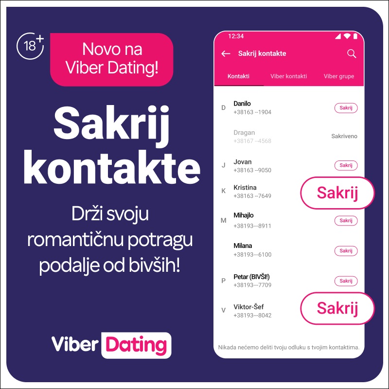 Sada, uz “Sakrij kontakte”, lakše nego ikad mogu se izbeći neprijatnosti, a korisnici mogu da se fokusiraju na ono što zaista žele – pravu konekciju, po svojim pravilima. Prijavite se besplatno za Viber Dating na: 👉 https://vb.me/viberdating_hidecontactspr