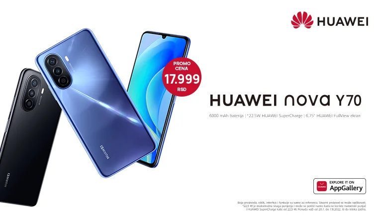 Kompanija Huawei ima novog člana poznate nova serije, a to je dugo najavljivani pametni telefon Huawei nova Y70. Povoljna cena i skup korisnih funkcija u kombinaciji sa modernim dizajnom je sve ono što je korisniku potrebno na jednom pametnom telefonu, a što su odlike baš ovog modela. Huawei nova Y70 je dostupan od danas na našem tržištu, a po promotivnoj ceni od 17.999 dinara biće od 20. jula do 7. avgusta, na sajtu huaweishop.rs i u prodavnicama.
