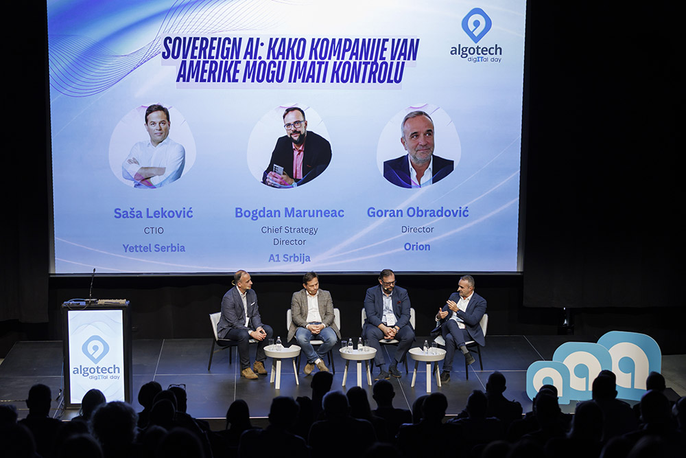 Panel „Sovereign AI: Kako kompanije van Amerike mogu imati kontrolu“ okupio je lidere iz telekom sektora – Sašu Lekovića (Yettel Serbia), Bogdana Maruneaca (A1 Srbija) i Gorana Obradovića (Orion), uz moderaciju Tihomira Bajića (X&), koji su diskutovali o digitalnom suverenitetu i kontroli nad podacima i AI sistemima.