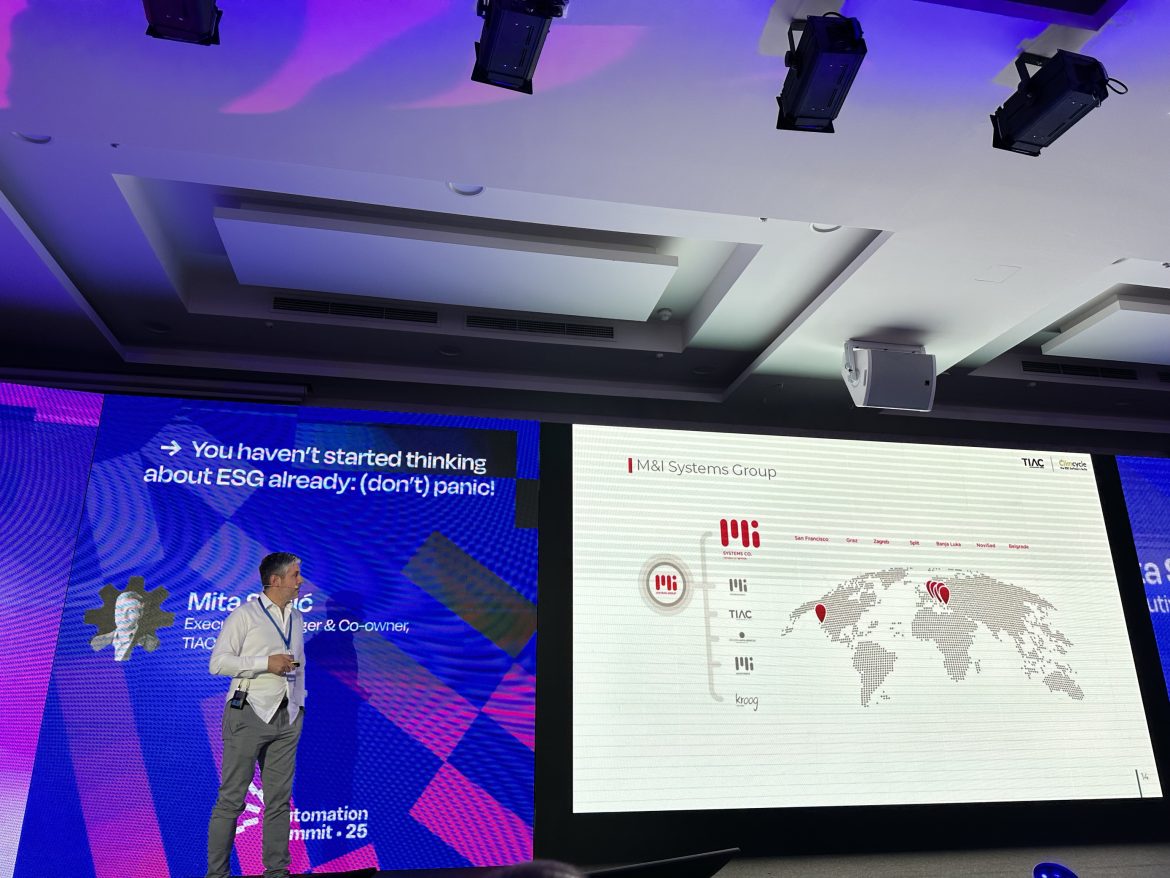 Upravo ta pitanja izazvala su veliko interesovanje na Automation Summit-u u Splitu prošle nedelje, gde je Mita Stojić, direktor kompanije TIAC koja je članica M&I Systems grupe, održao predavanje pod nazivom „Još niste počeli da razmišljate o ESG-u? (Ne) paničite!“. Kroz svoje izlaganje, Stojić je osvetlio ključne tehničke i poslovne izazove s kojima se kompanije susreću prilikom uvođenja ESG rešenja, kao i konkretna softverska rešenja koja mogu da unaprede poslovanje i omoguće efikasno sprovođenje ESG principa poslovanja.