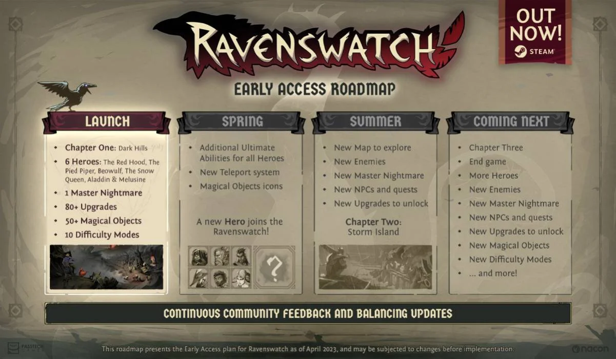 Ravenswatch je roguelike akcijska igra iz ptičje perspektive koju je razvio Passtech, tvorac igre Curse of the Dead Gods, a dostupna je u ranom pristupu na jednogodišnjem razdoblju. Ravenswatch se odvija u svetu Reverieja. Ovaj bajkoviti svet temelji se na starim legendama i narodnim pričama, uključujući Tri prasića, Crvenkapicu i čak nordijsku mitologiju prikazanu u tamnoj fantasy stilu. Noćne more preuzimaju svet, uništavajući i kvariti sve na svom putu. Na vama je, bilo da igrate sami ili u kooperativi sa do četiri prijatelja, da zaustavite Noćne more i ojačate svoj lik pre nego što se pojavi Gospodar Noćnih mora nakon 20 minuta. Ako niste prošli većinu karte pre ovog trenutka, suočićete se s ovim šefom s oslabljenim likom. Što ste brži, to vam je lik moćniji, pa je vreme od suštinske važnosti i ne možete se vući.