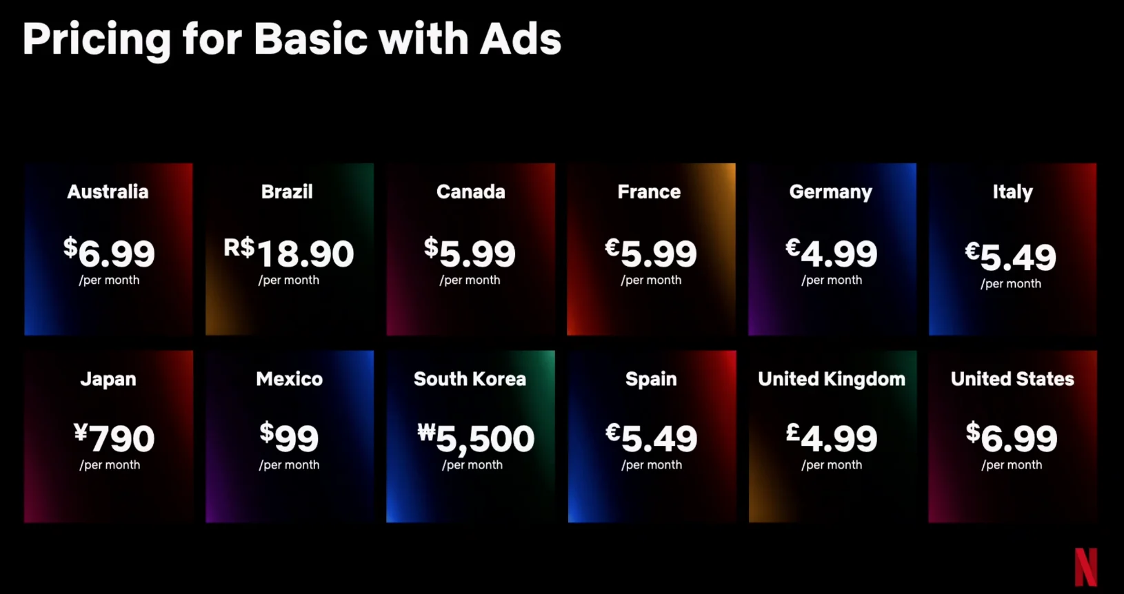 U 11 država je Netflix krenuo s reklamama za sad. Netflix je u SAD-u, Kanadi, Francuskoj, Velikoj Britaniji, Nemačkoj, Italiji, Španjolskoj, Japanu, Meksiku, Južnoj Koreji i Australiji lansirao dugoočekivani model jeftinijeg streaming servisa s oglasima pod nazivom Basic with Ads. Koštaće 6,99 dolara mesečno.
