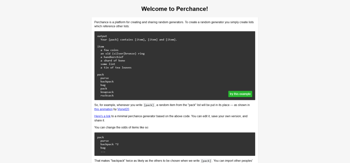 Perchance je fleksibilna i intuitivna platforma za generisanje sadržaja baziranog na slučajnosti. Namenjen kreatorima, piscima, dizajnerima igara i svim kreativcima, sajt omogućava korisnicima da kreiraju i dele generatore za tekstove, brojeve, ideje i druge vrste podataka, koristeći jednostavan jezik za programiranje.